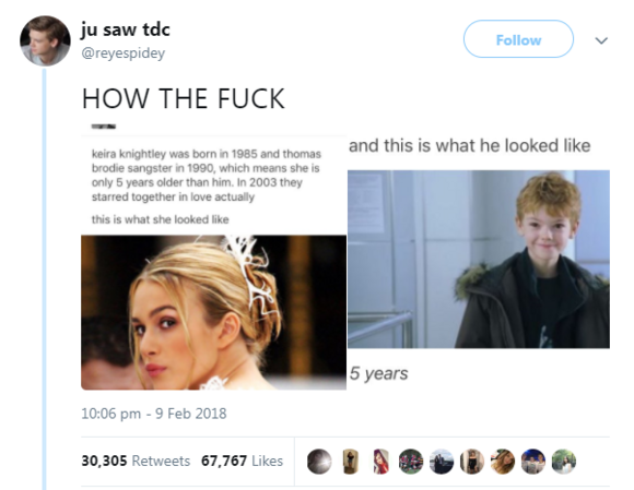 Love Actually L Ecart D Age Fou Entre Keira Knightley Et Thomas Sangster from www.madmoizelle.com Doing some fact checking, this tweet is accurate, despite them looking to be in very different stages of life in love actually! Thomas sangster was 13 and keira knightley was 18 when love actually was released in 2003 that's a 5 year age gap of 1985 to 1990 so they were both teenagers at the time one was starting to be one and the other was finishing it.#loveactually. Read on to learn about this odd age gap that's raising eyebrows.
